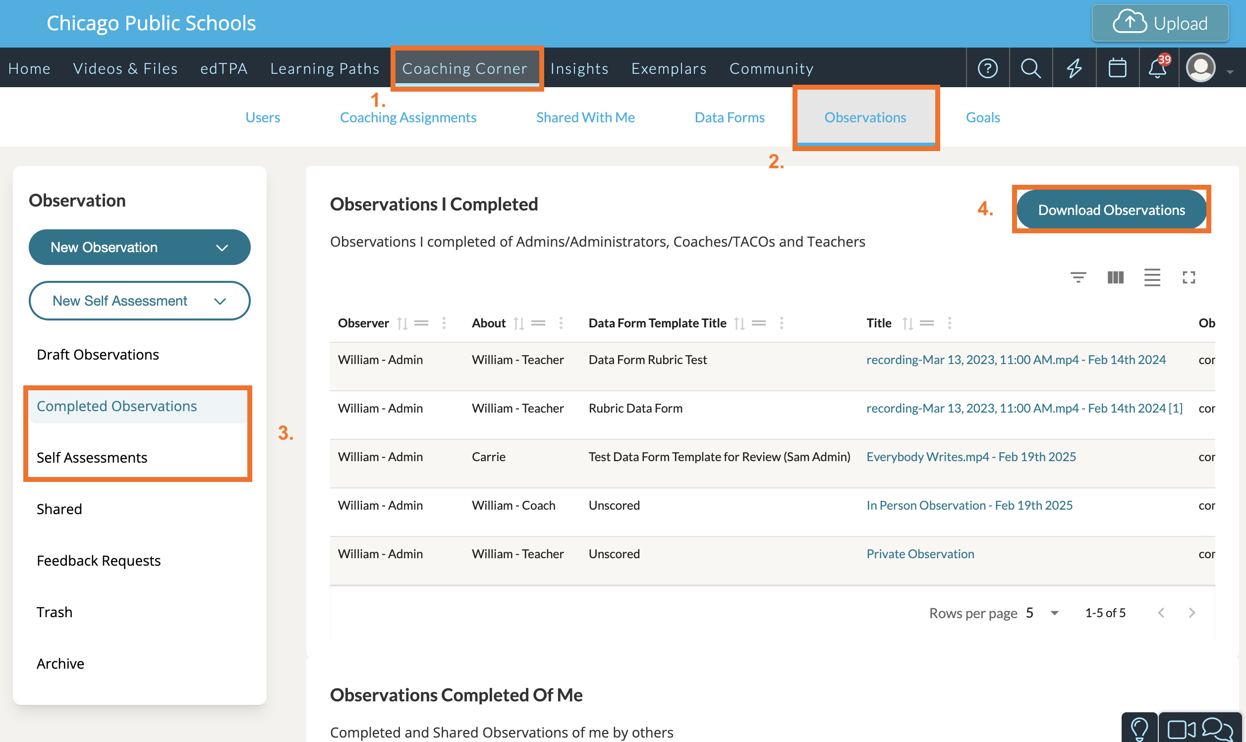 NOTE:  If you are an Admin (or a Coach with specific system setting privileges) you will also find other users' completed observations/self assessments here.