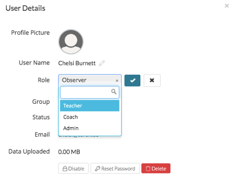 From here, you can click the 'pencil icon' next to Observer and select the desired role from the dropdown menu that appears. When you are done, click the blue checkmark icon.
