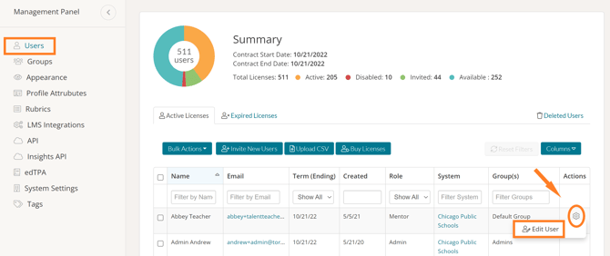 Once there, find the user whose role you'd like to edit. Click on the gear icon in the Actions column in the row of that user and select 'Edit User.'