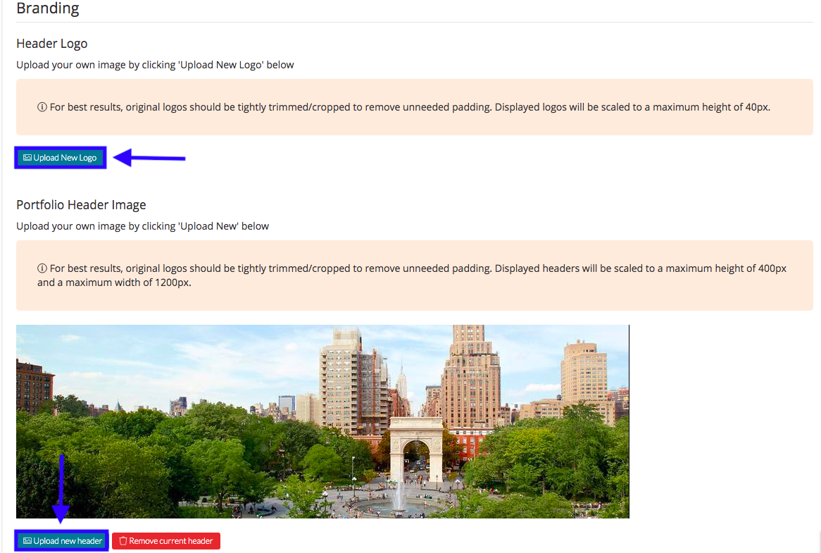 Under 'Branding,' you can upload your school or organization’s logo by selecting 'Upload New Logo.' The logo will appear on the Talent header for everyone in your system. You can also upload a photo for the header of your system's 'Portfolio' page, if your system has that feature enabled.