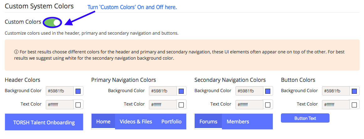 You can even customize the colors of Talent to match your organization's branding by turning 'Custom Colors On.' You can either select the specific color you like using the color palette, or if you know the specific color code, you can enter it in the appropriate text box. You can change the background color and the text colors of the header, as well as the background and text colors for primary navigation, secondary navigation, and buttons.