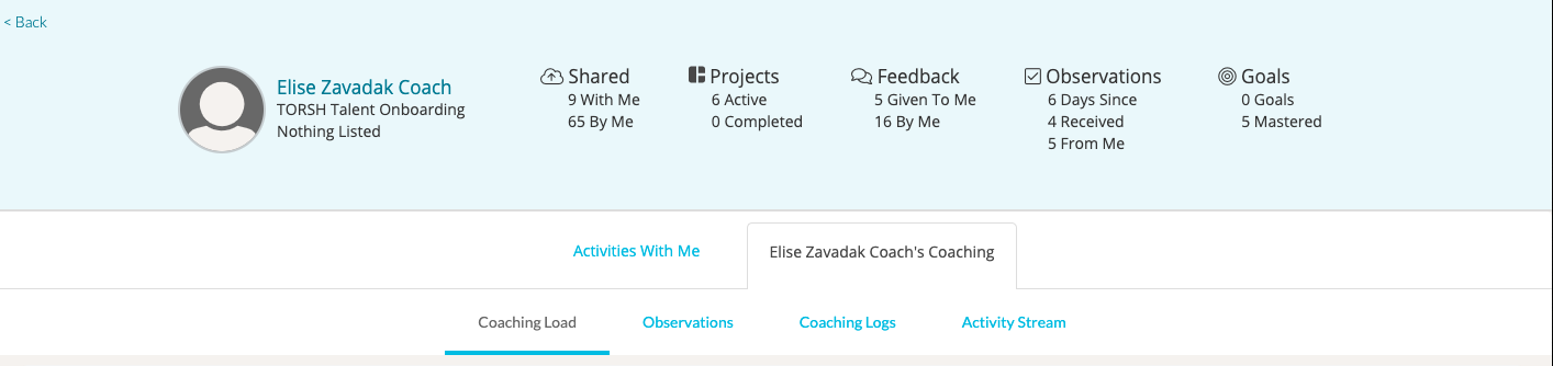 You can then see data associated with that coach's observations they have conducted, any data forms they have completed, and an Activity Stream of all of their coaching activities.