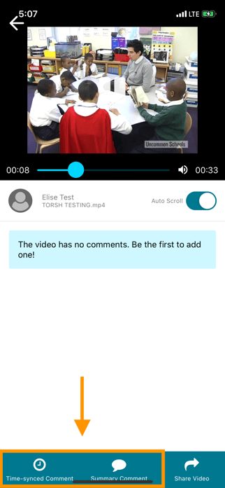 To comment on a video on the TORSH Talent mobile app, tap on the video from the Videos & Files page in the app. The video will automatically play and at the bottom of the screen, you will see the option to leave a Time-Synced Comment or Summary Comment.