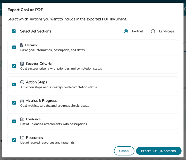 In the next pop-up, you can select which parts of the goal you would like to have included in your PDF document. Click 'Export PDF' in the bottom right-hand corner once you have made your selection.