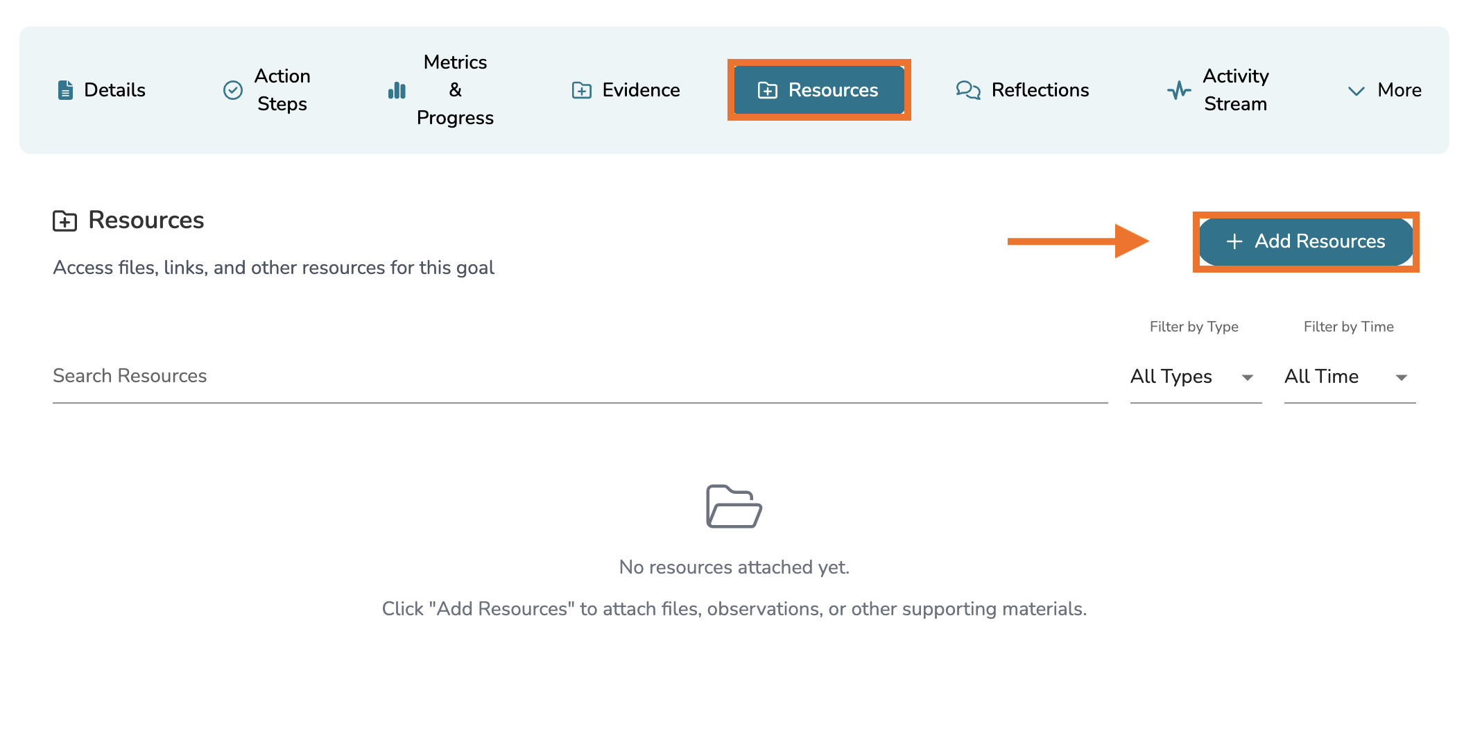 To add resource documentation to a goal, click on the 'Resources' tab and then click 'Add Resource.'