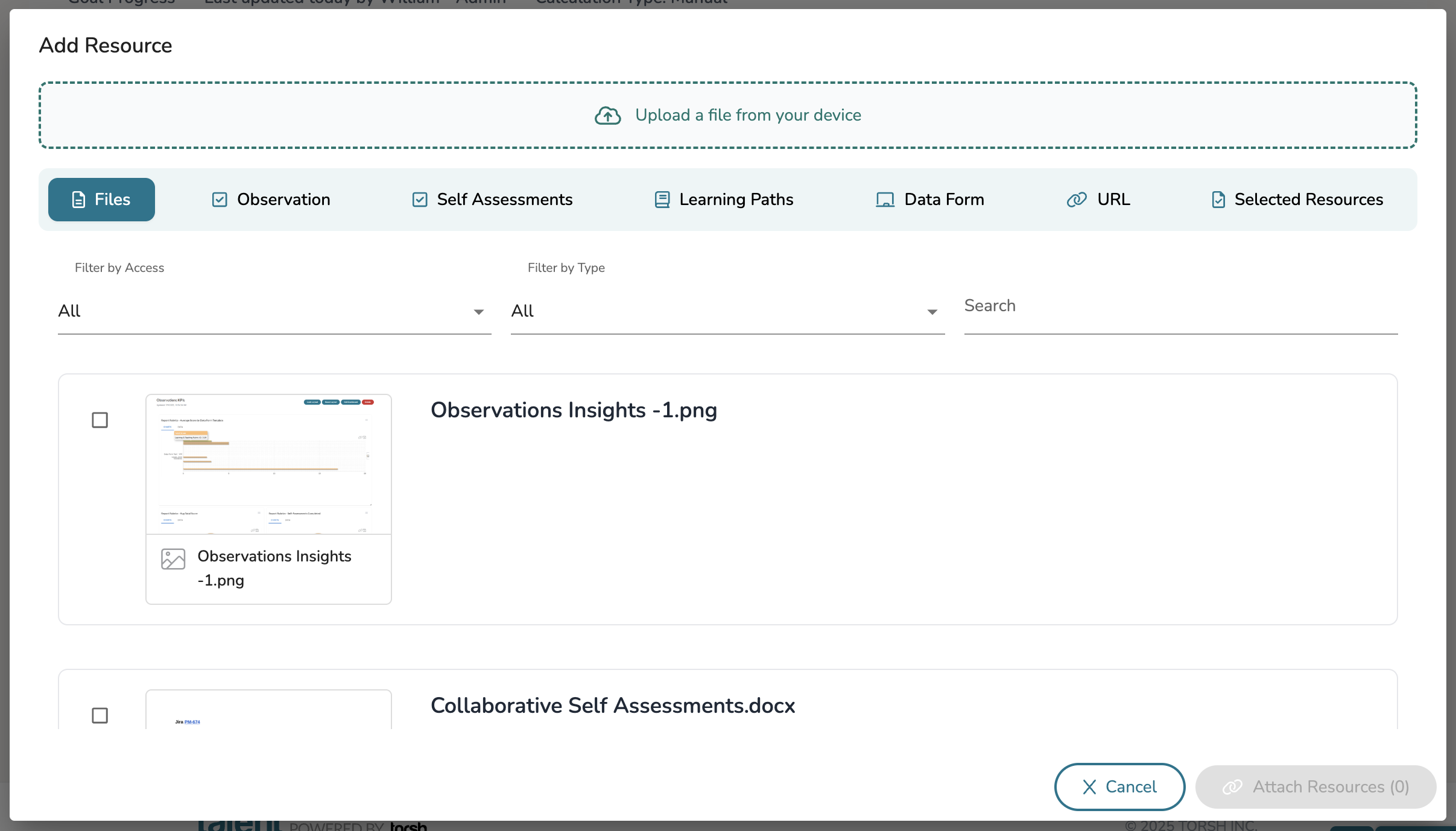 From there you can choose to include either specific artifacts uploaded and created or upload new artifacts as a resource to the goal.