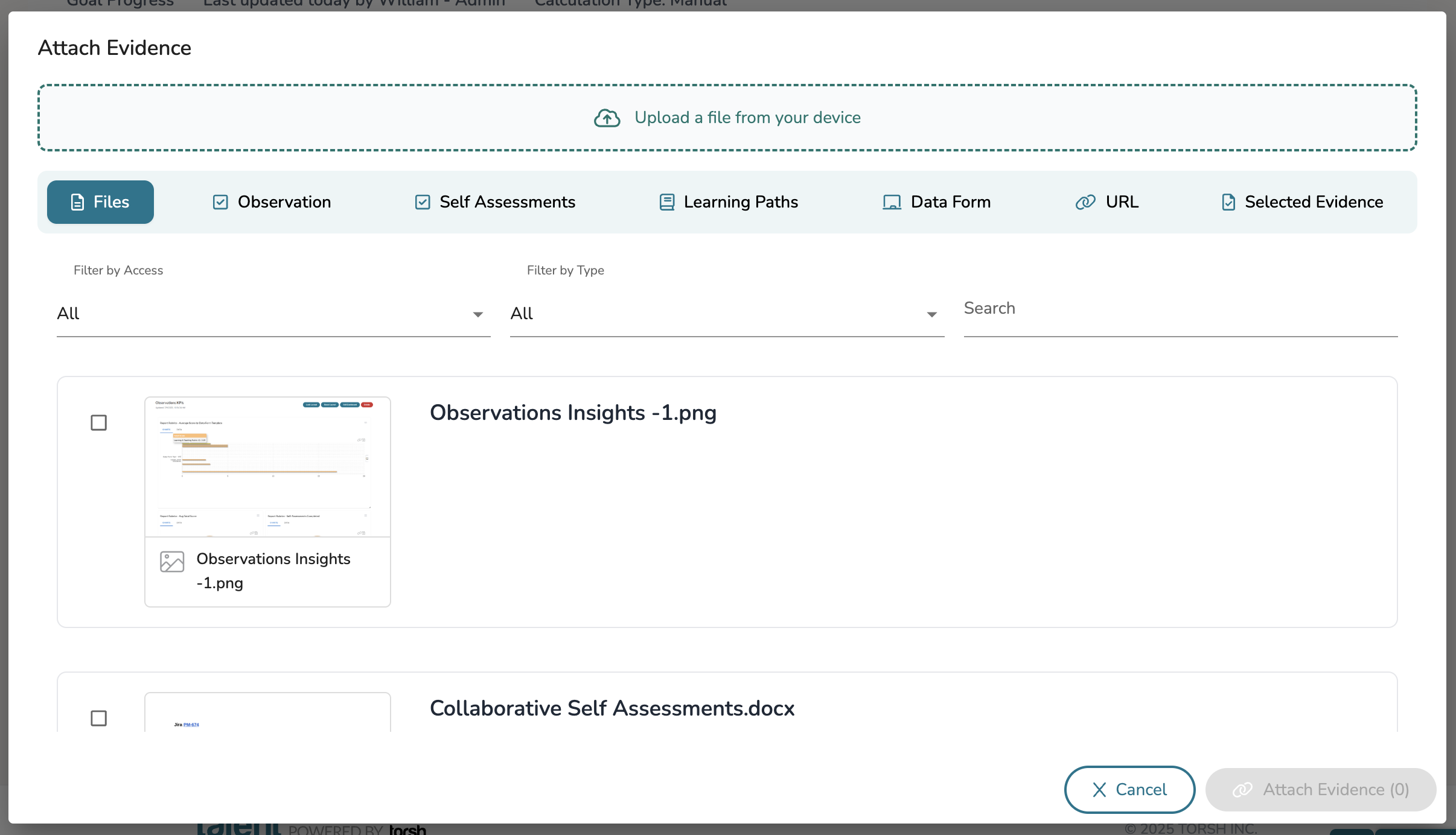 From there you can choose to include either specific artifacts uploaded and created or upload new artifacts as a piece of evidence to the goal.