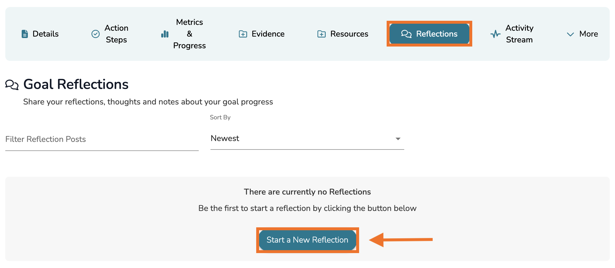 Click 'Start a New Reflection' to get started and enter your text in a comment post. Click 'Post' to post your comment to the goal.