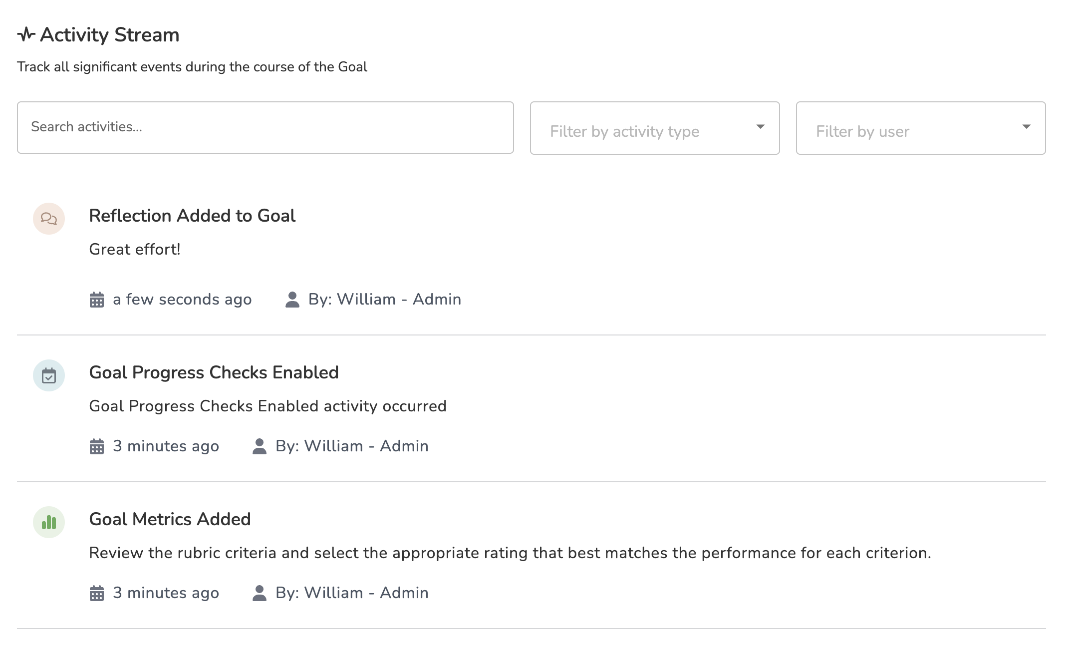 Any and all modifications made to a goal - including action step additions, resource/evidence attachments, progress updates, and notes - will be logged in its Activity Stream tab. Here you can scroll through and find a list of each specific action made to the goal, when the action was performed, and by whom.