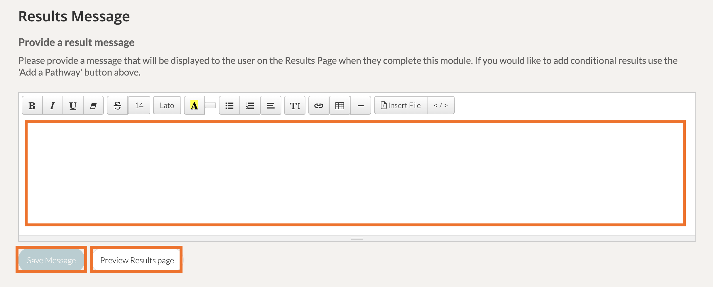 On the Settings page, scroll down to the bottom section labeled 'Results Message.' Here you can type up the generic message that will appear for users who complete the module you created. You can even preview how the message will appear by clicking 'Preview Results page'.