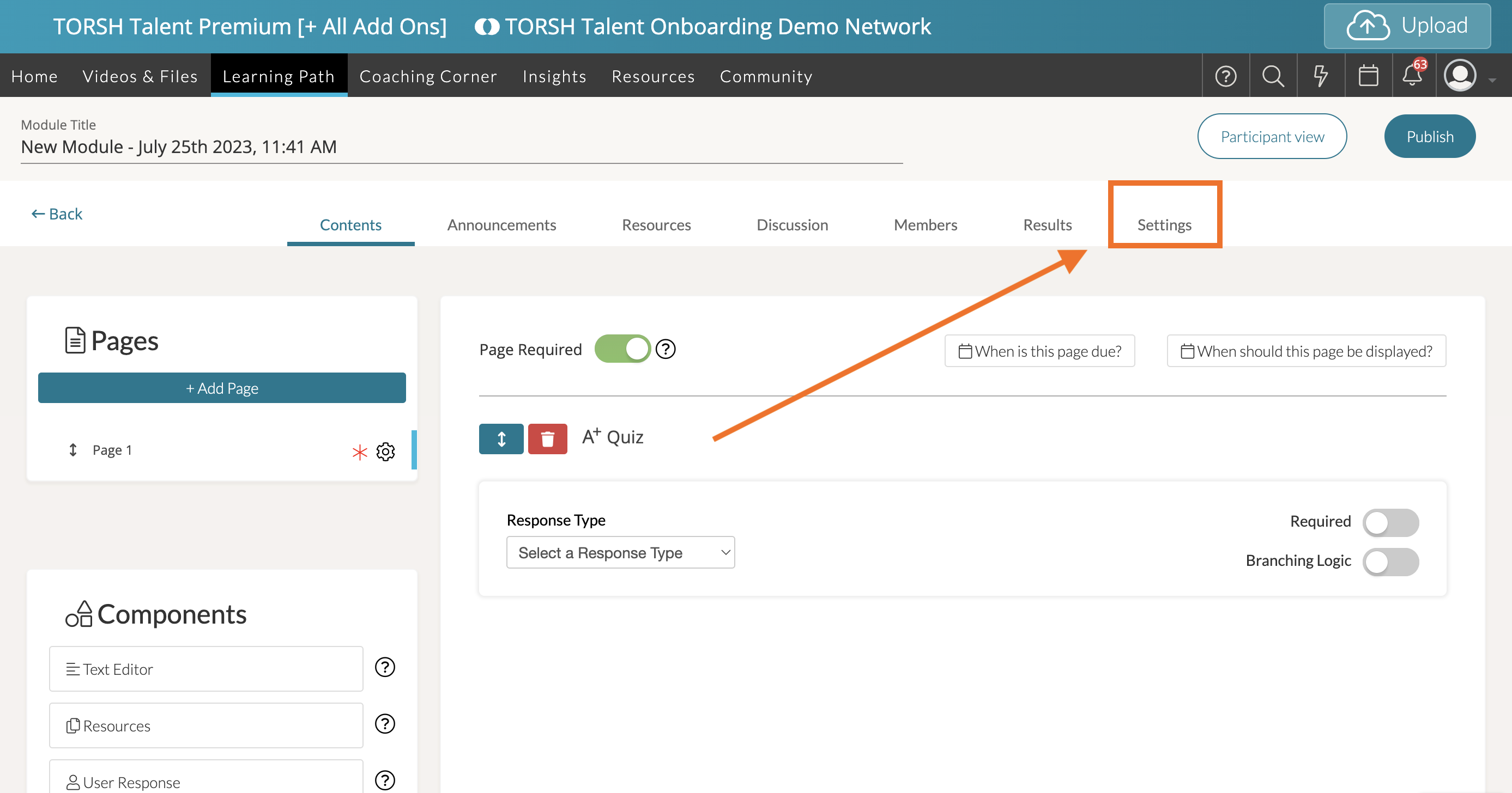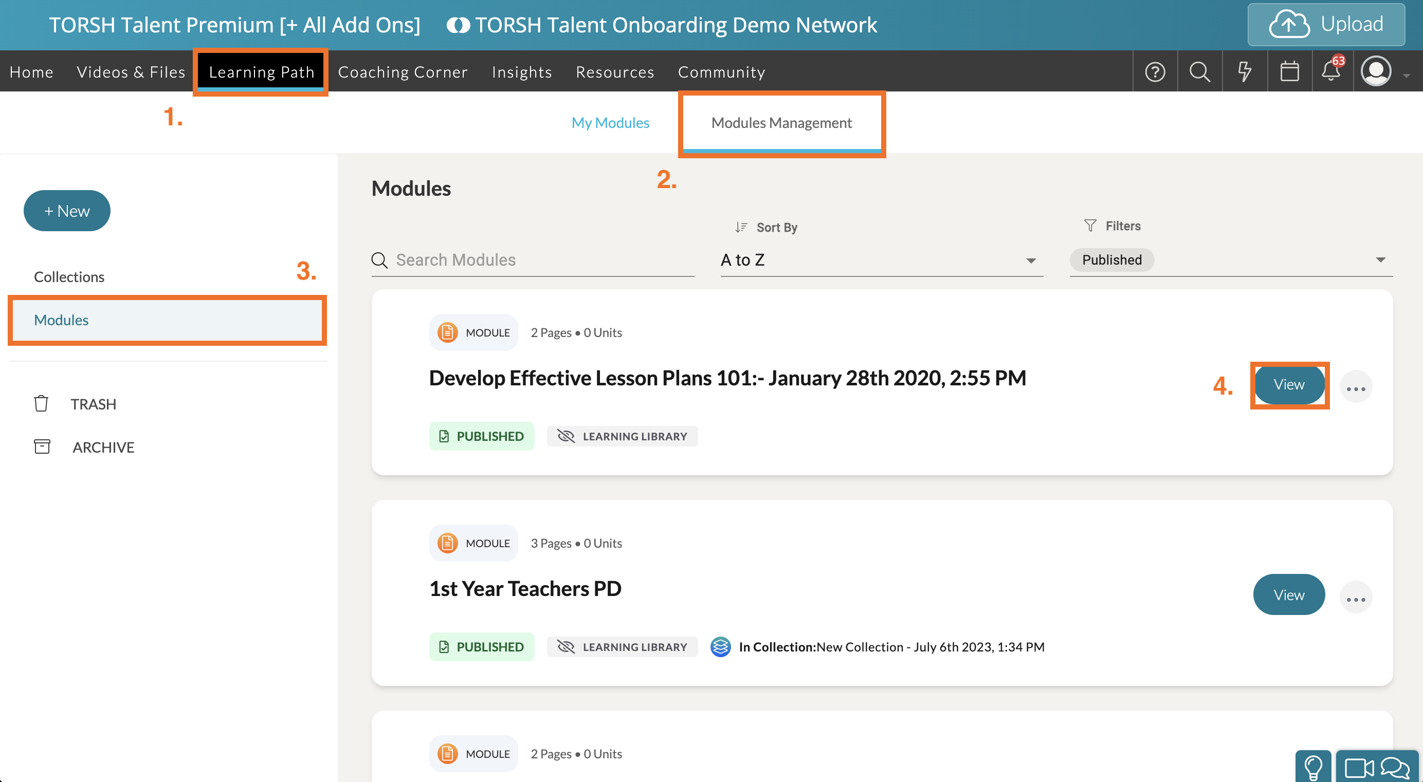 To do so, you will need to navigate to your module's settings. First, navigate to 'Learning Paths.' Then click 'Modules Management.' Click 'Modules' on the far, left-side panel and then find the module you would like to modify. Click 'View.' This will take you to the modules 'Contents' page.