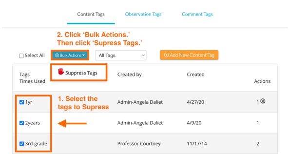 If you would like to suppress more than one tag at a time, select the tags you'd like to suppress then choose 'Suppress Tags' from the 'Bulk Actions' button.