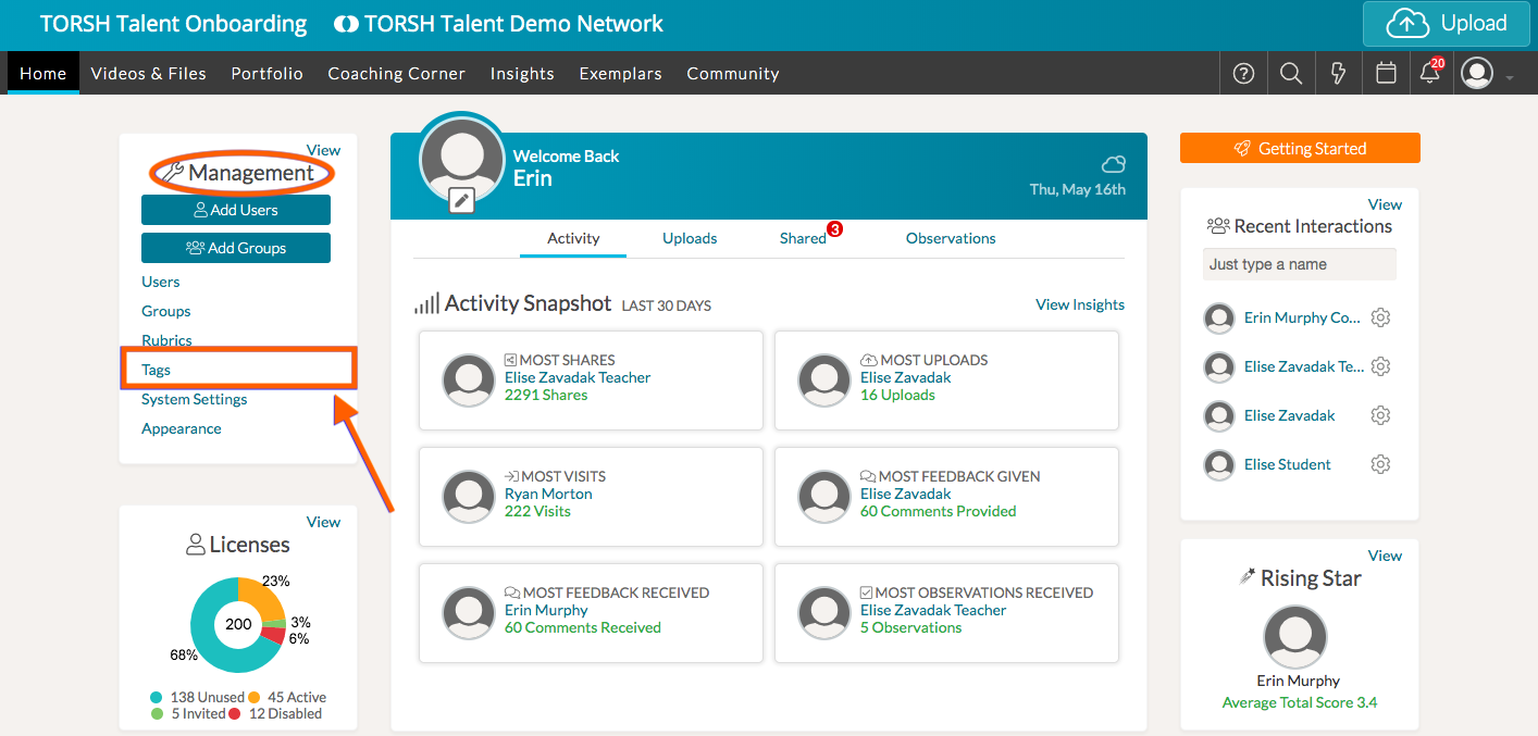 All users can create Content Tags in the Overview section of their uploaded videos & files for better organization. As a System Admin, you can create and manage content tags for your system. To do so click on 'Tags' from the Management panel on your Talent homepage.