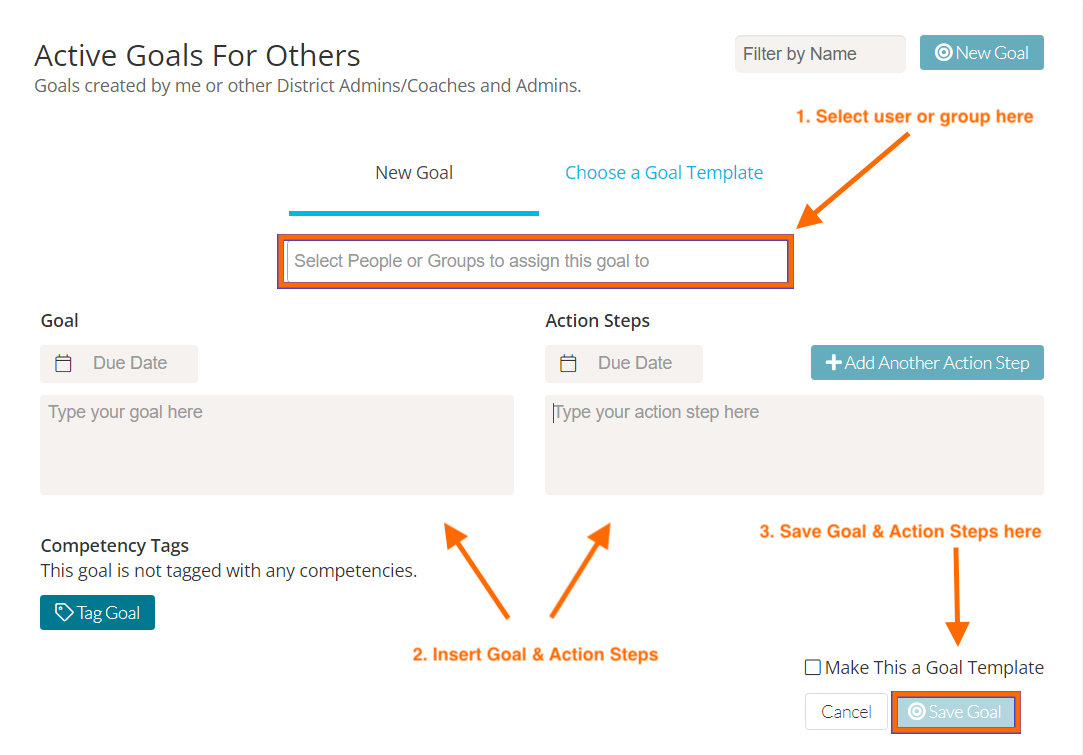 If you wish to set a new goal, you can select 'New Goal,' find the user who you wish to set the goal for, enter that goal, add a due date, and any Action Steps if desired, then press 'Save Goal & Action Steps.'