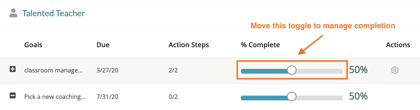 To manage goals for a user, locate them and slide the bar to mark the goal any percentage of complete.
