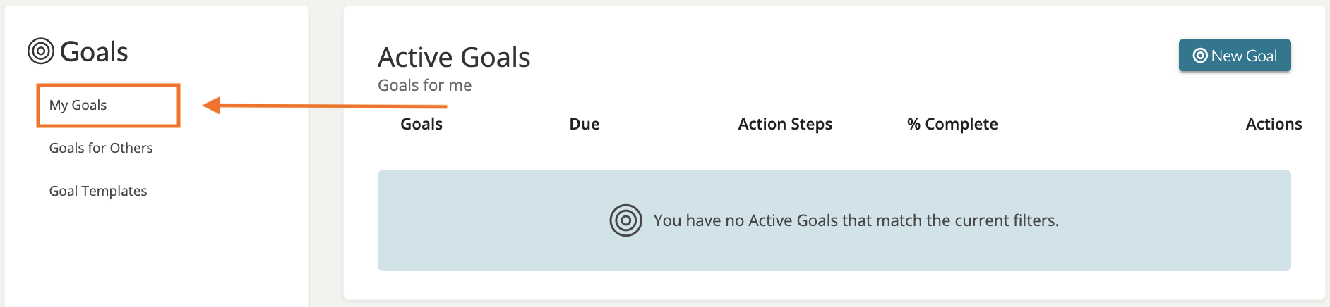 To view your own goals in this system, you can select 'My Goals' from the left-hand side. Here you will see goals that have been created by you, other coaches, and admins. If you are a Mentee, you cannot modify a goal you set for yourself after it’s been modified by a Coach.