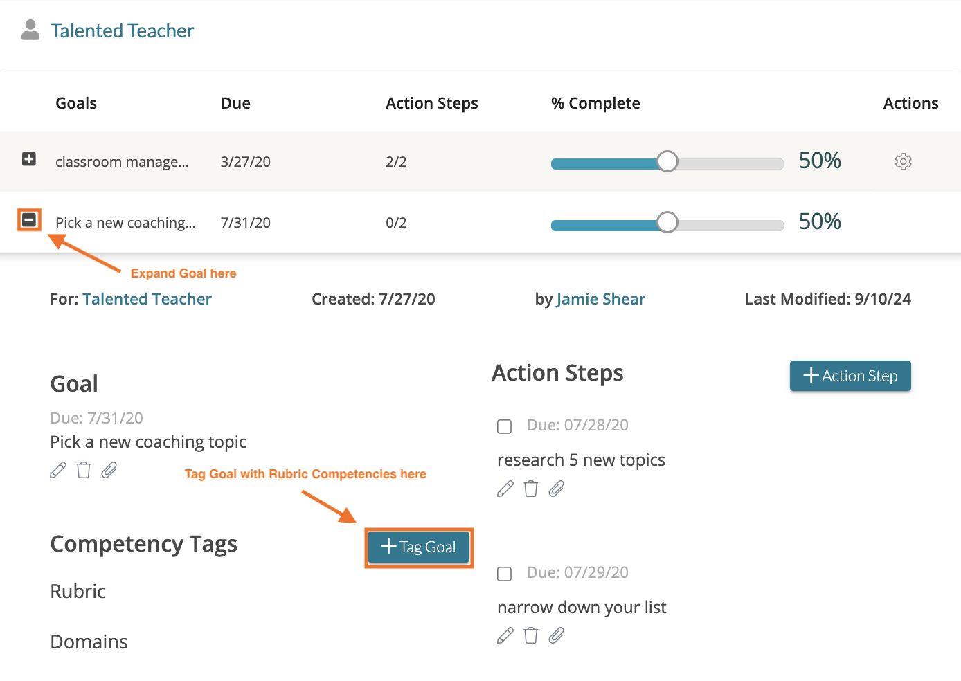 If you expand the goal by pressing the plus button, you can tag the goal with any Rubric Competencies by choosing the rubric you wish to tag it with, and selecting different aspects of the rubric that this goal aligns with.