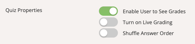 Once the module has loaded, click on its 'Settings' tab. Scroll down to the 'Quiz Properties' section. From here toggle 'Enable User to See Grades' to enable user grades to display for this module. Doing so will allow an average score out of 100 to display on the bottom, right-hand corner of the module card when a user completes the module and sees it on their My Modules page in Talent.