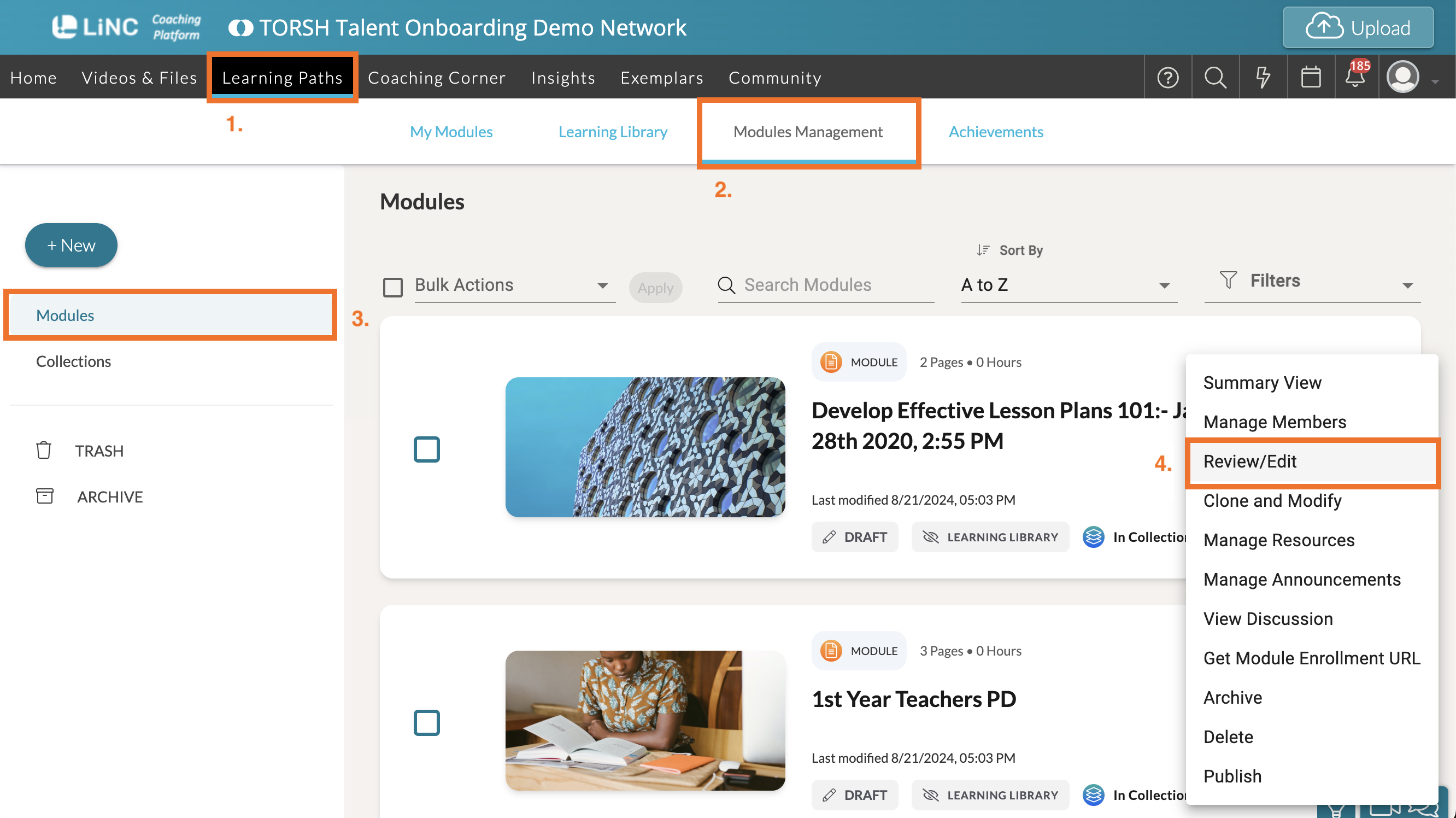 To enable user grades for completed modules, you will need to manage each specific module's settings. To do so, navigate to Learning Paths and choose 'Modules Management.' From there, search for your specific module and then click on its '...' icon. In the dropdown menu, click 'Review/Edit' to modify the module.