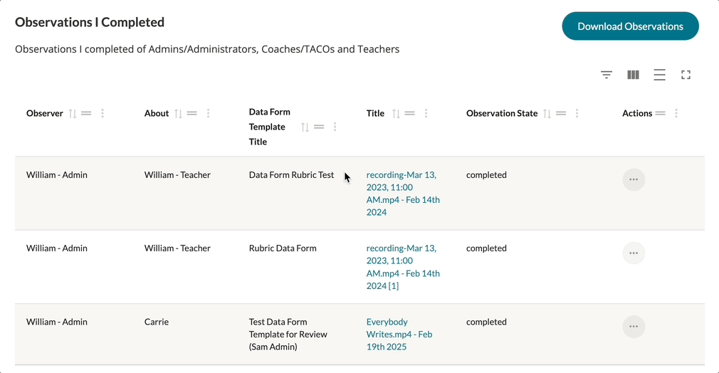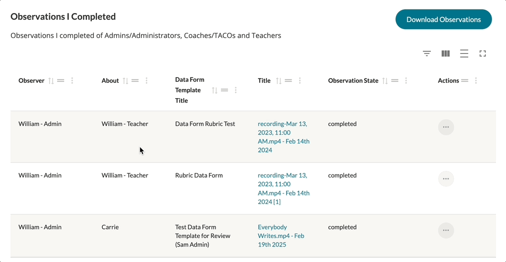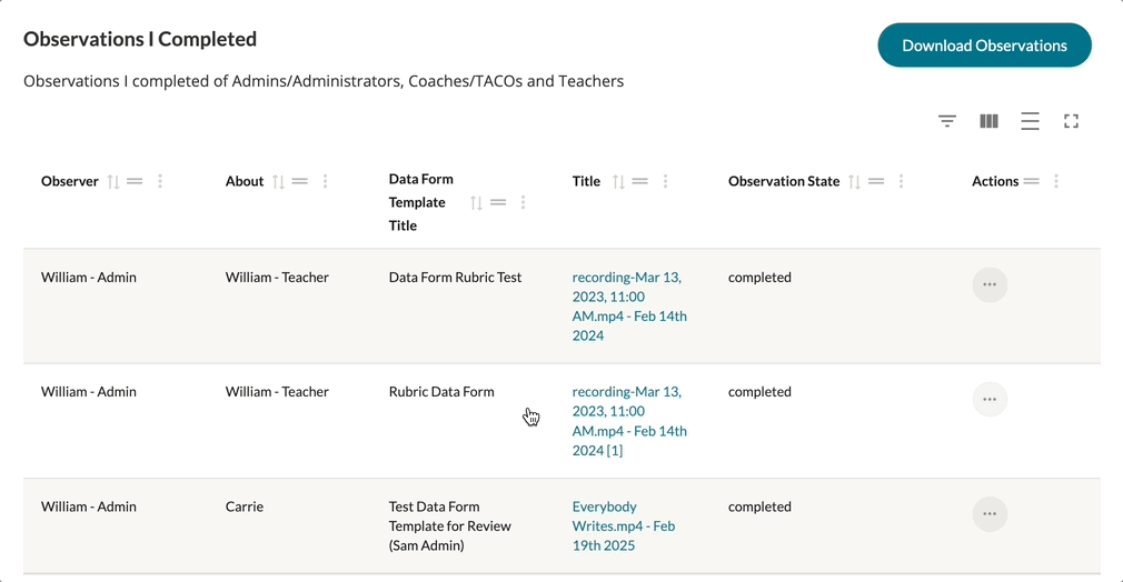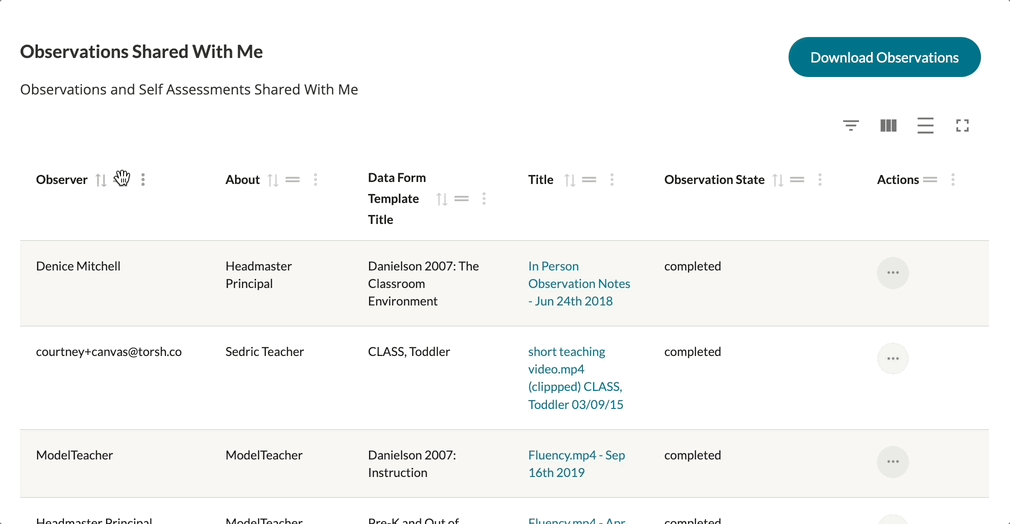 Each table in your Observations and Self Assessments can have their display further modified via the display options found in the top, right-hand corner of each table. Each table displays with a Show/Hide Filters, Show/Hide Columns, Toggle Density, and Toggle Fullscreen buttons (from left to right respectively).