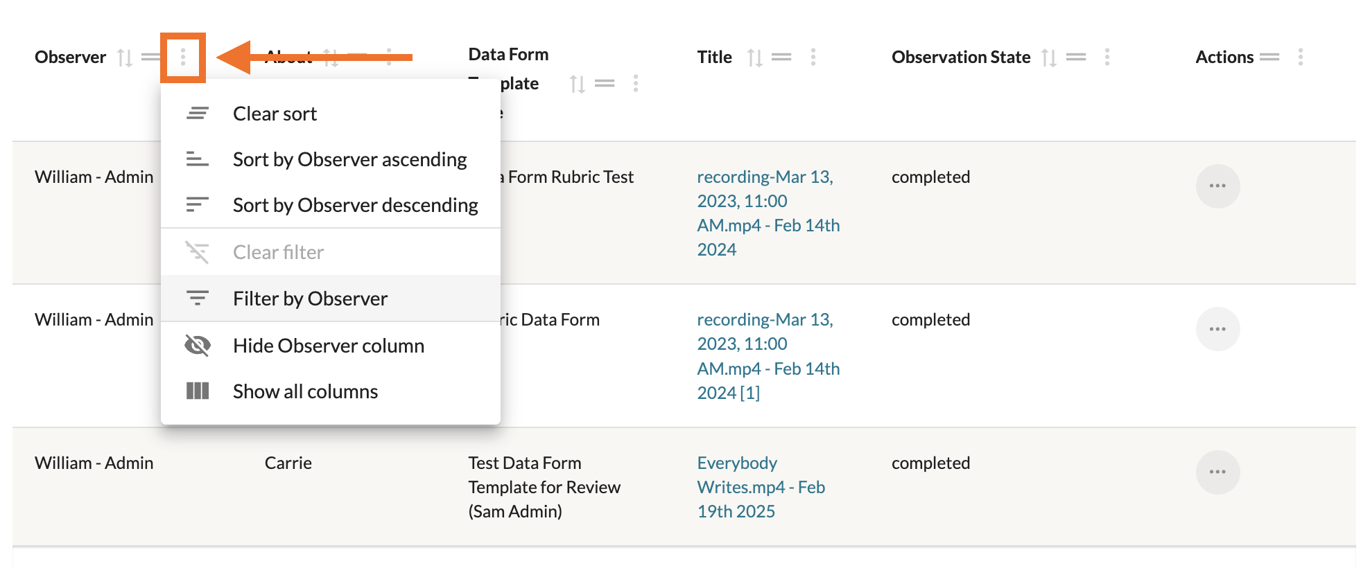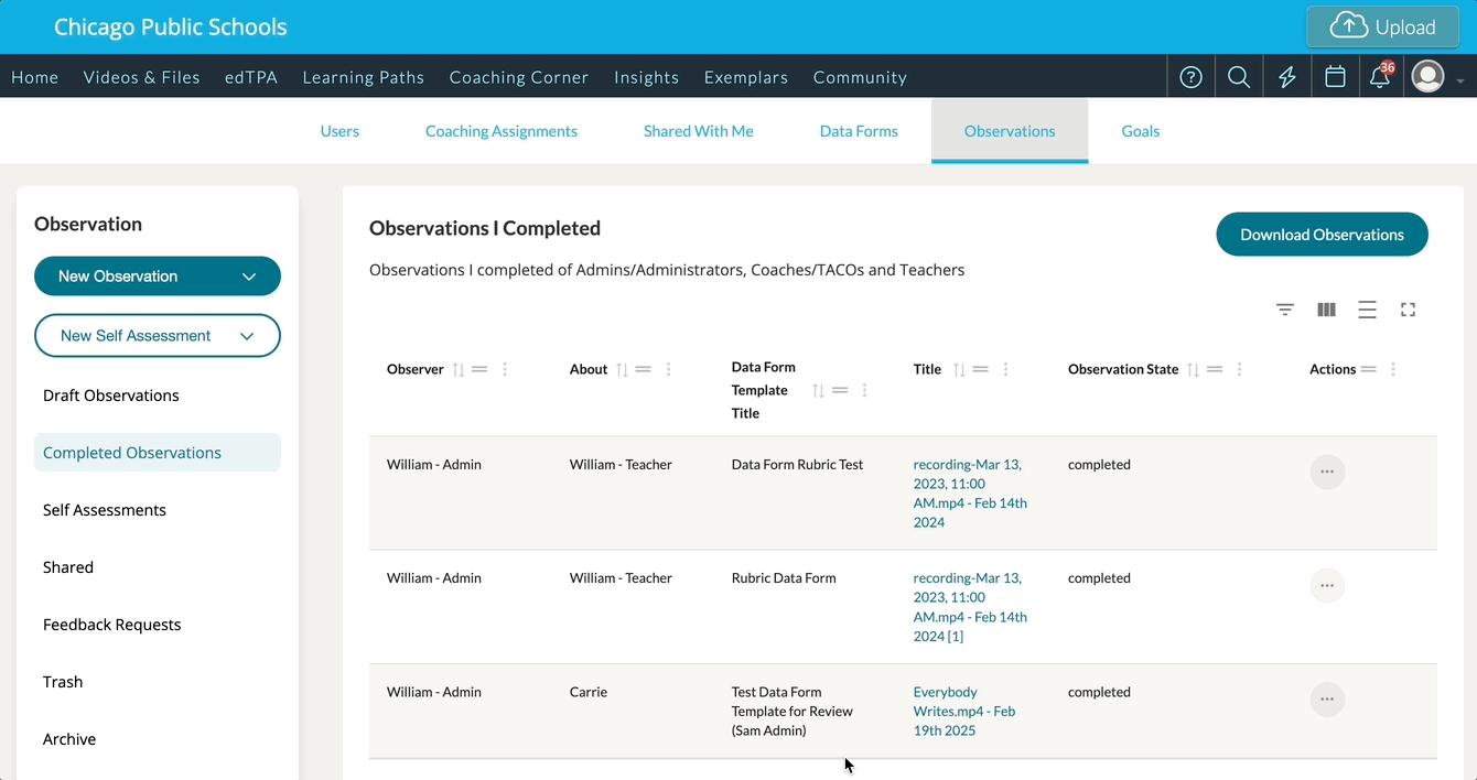 When viewing any Drafted or Completed Observations and Self Assessments in Coaching Corner, you can sort and filter which forms display via the various columns presented in each table.