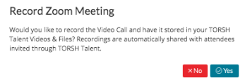 If you are using the Non-HIPAA platform of TORSH Talent, you will then be prompted to decide whether or not you want to record this Zoom call to have it stored on your TORSH Talent Videos & Files page. This recording will be automatically shared with all attendees. Select ‘Yes’ or ‘No.’