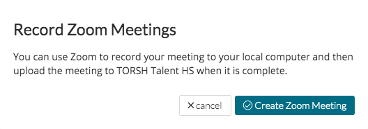 Talent HS Users                                                                                                                            If you are using TORSH Talent HIPAA-Secure, click ‘Create Zoom Meeting.’ If you want to upload this video to your TORSH Talent HS account, you will need to record the Zoom meeting to your computer and then upload it using our Desktop Uploading feature.