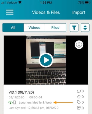 If you are using our TORSH Talent mobile app, any videos or photos that have successfully uploaded to your account will have a green cloud icon and say 'Location: Mobile & Web' on the preview of the file along with the 'Last Synced' time and date.