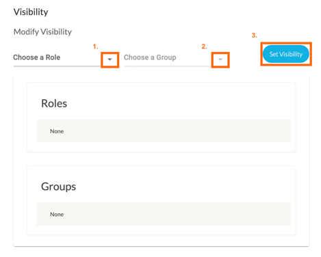 This will take you to the Settings page of the data form template. Here you will see (2) dropdown menus for Visibility section - one for Roles and one for Groups. Please select the dropdown arrow for each type to assign which users in your system will be able to use that data form template. To save your settings, click the '+ Set Visibility' button.