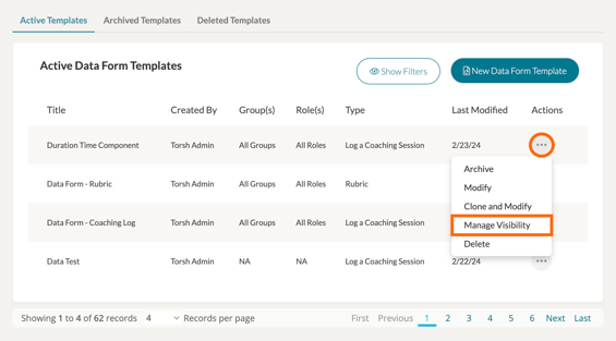 This will take you to a page listing all active, archived, and recently deleted data form templates in your system. Find the active data form template you would like to manage and click on its '...' icon. Then click 'Manage Visibility' from the dropdown list.