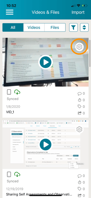 To manage your videos and files on the TORSH Talent mobile app, first click on the gear icon on the video or file you wish to modify from your 'Videos & Files' page.