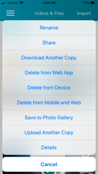When you tap on the gear icon, you will view an actions menu that will vary depending on the status of the video or file and your connection status.