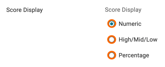 By default, your rubric data form template will display its scores with 'Numeric' values. You can instead choose to display them as either 'High/Mid/Low' rating values or 'Percentage' values.