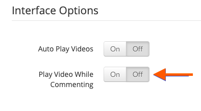 - On your Account Settings page, scroll down to 'Interface Options' and ensure 'Play Video While Commenting' is toggled to 'OFF.' This will ensure that your video will pause while commenting.