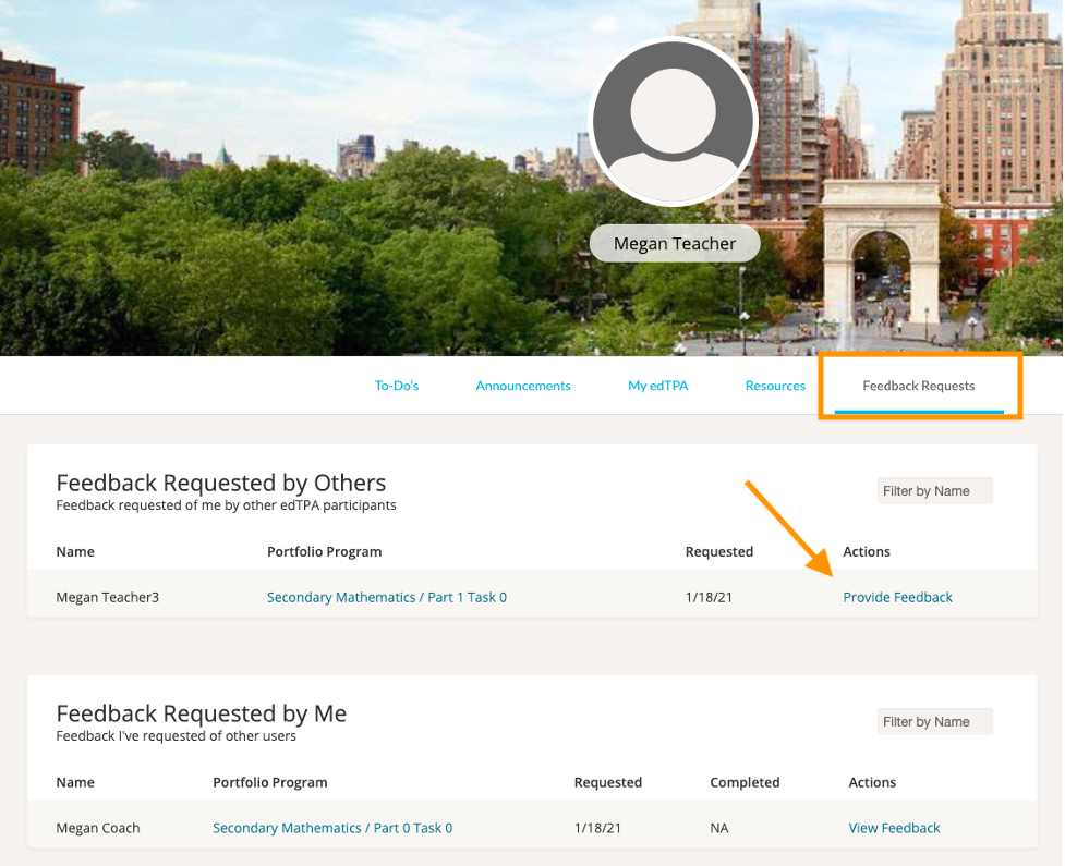 If an edTPA member has requested feedback from you on their edTPA portfolio, you can respond to the request by clicking ‘Feedback Requests’ from within edTPA.