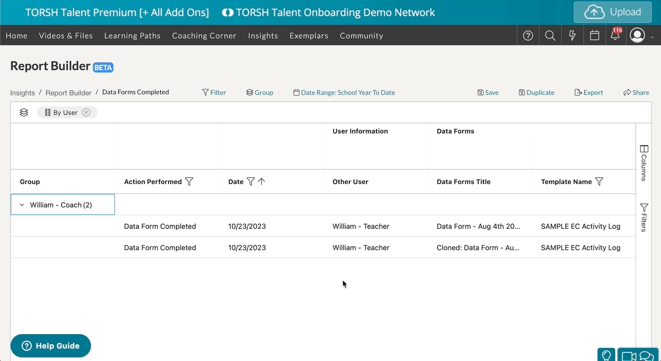 In Report Builder, you can generate a customizable report of Data Forms completed, filtering for one specific form template at a time, along with all answer choices selected and all comments made within the form.