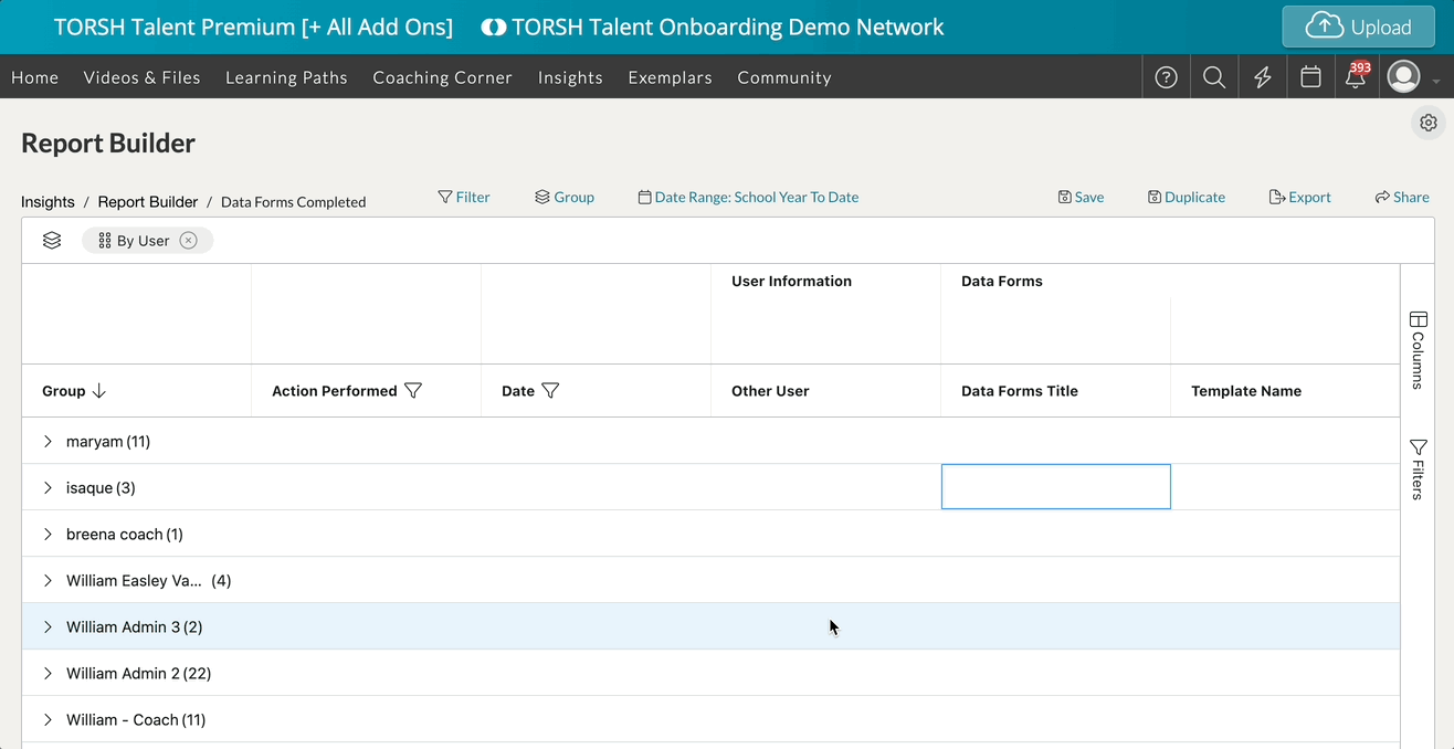 Once that filter is applied, go to the Columns menu on the far right and then expand the 'Data Forms' datatype. In the list of columns, scroll down further and you will begin to see a list of Data Form Templates. Check off the name of the data form template you filtered by to display all answer choices for this rubric as added columns in your report.