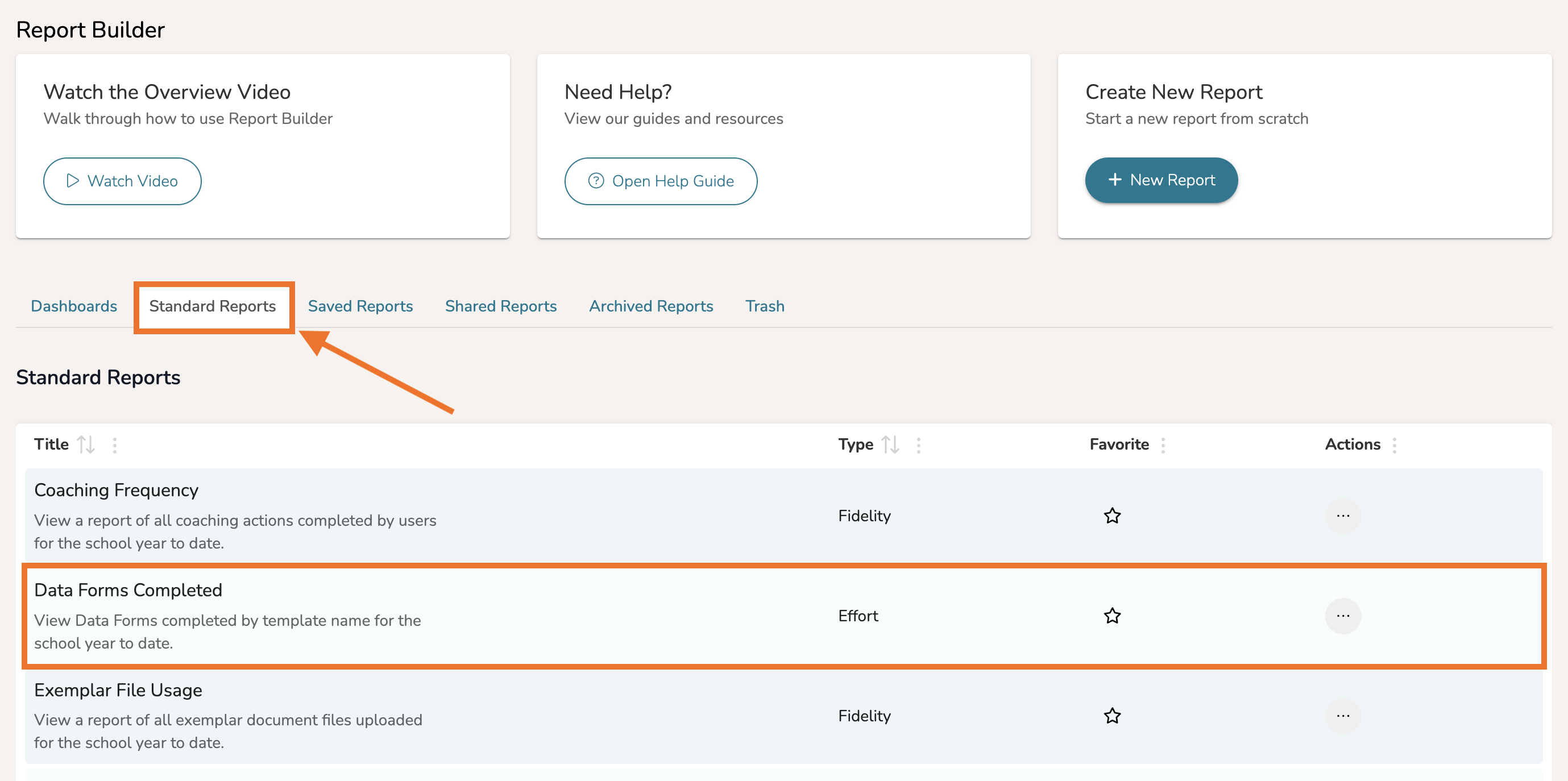 Next, navigate to the 'Standard Reports' tab. From there, scroll through the list of templates and open 'Data Forms Completed.'