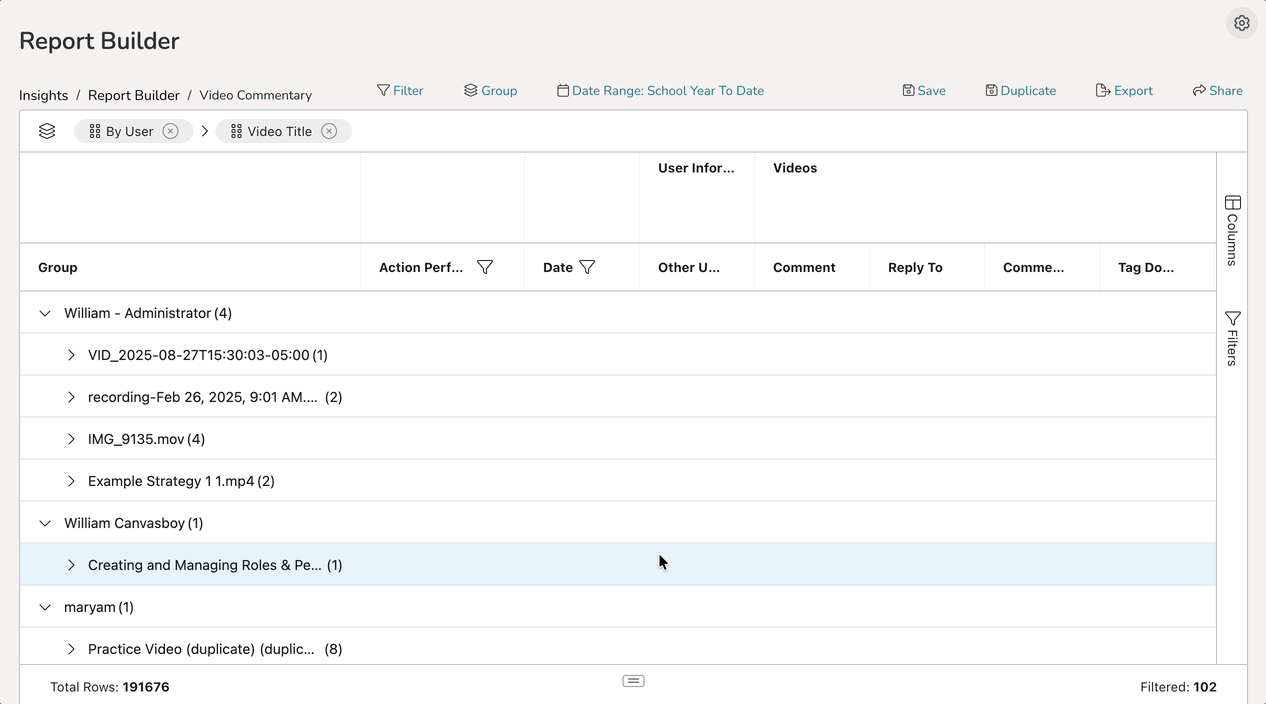 This report displays groupings of individual 'By User' listings, along with all respective comments made within each video. Click beside each user, and then each video listed to display each of the comments they made.