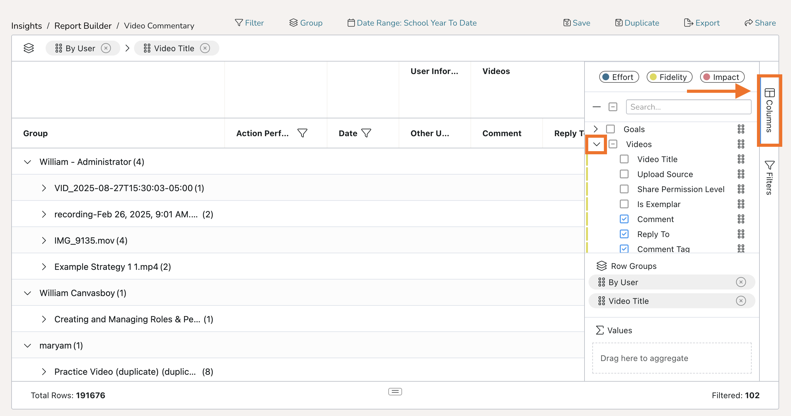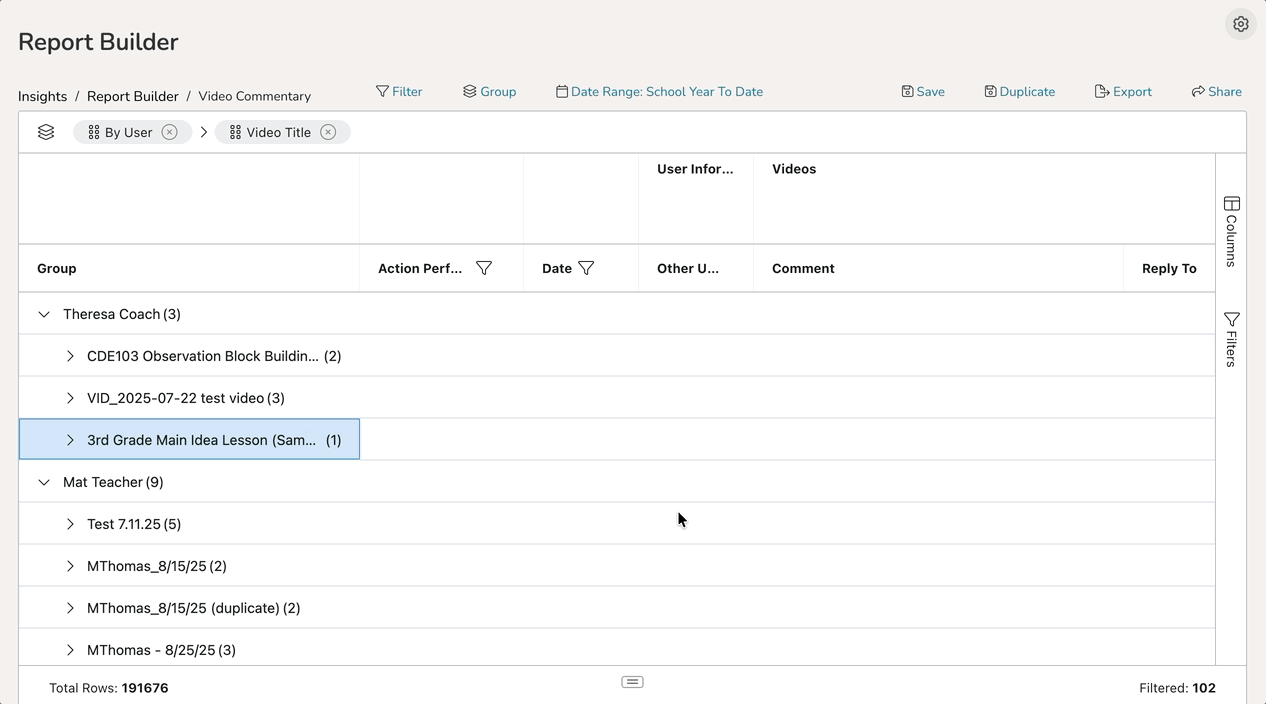 In Report Builder, you can generate a customizable report of video comments made to better track coaching interactions within Talent.