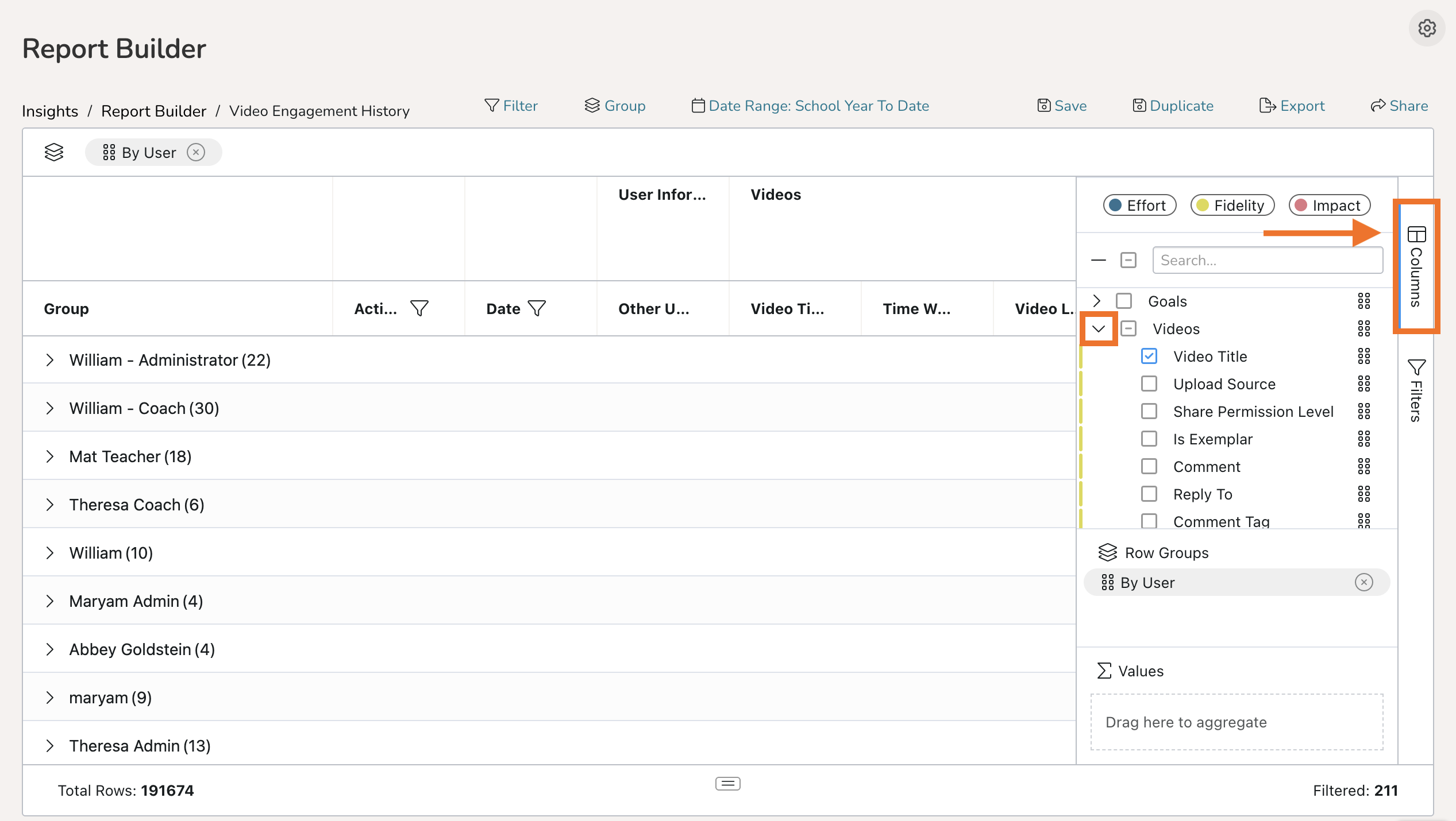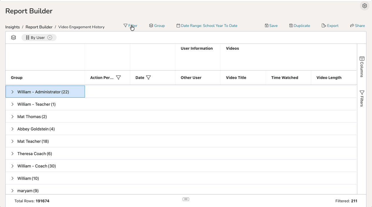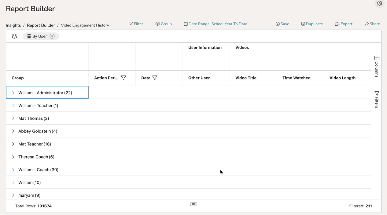 In Report Builder, you can generate a customizable report of video time watched to track video activity across any date range.