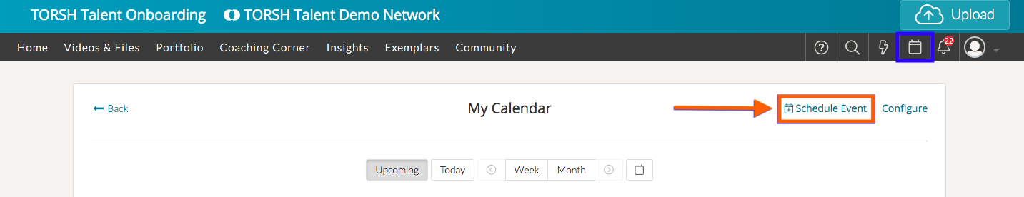 In TORSH Talent, click on the 'calendar icon' to display your calendar of upcoming events and show all of your meeting requests.