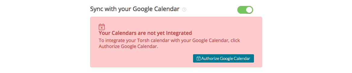 To sync your TORSH Talent calendar with your Google Calendar, scroll to the bottom of the page and click the button next to 'Sync with your Google Calendar' so that it displays as 'green.' You will then be directed to authorize your Google calendar configuration.
