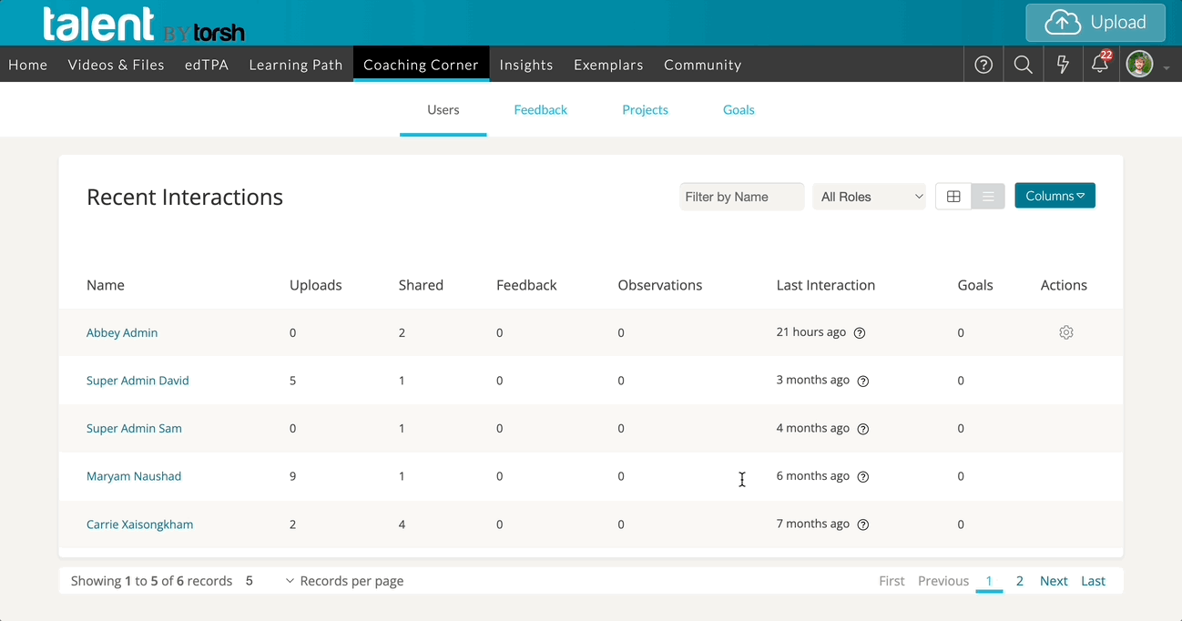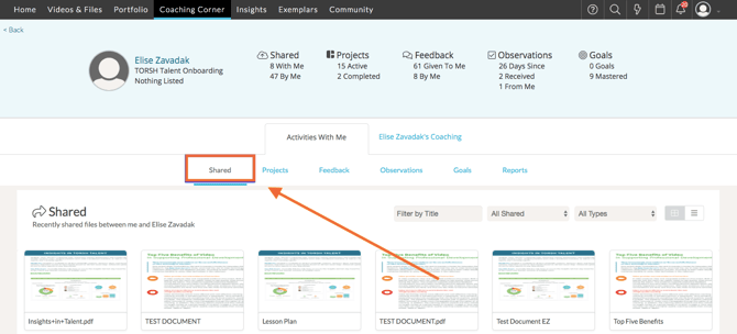 To view all of the videos & files shared between you and another user in Coaching Corner, first click on 'Coaching Corner' in your top navigation bar. From there, you will be brought to the Users tab, wherein you can view Recent Interactions as well as All Users you can interact with on the platform.