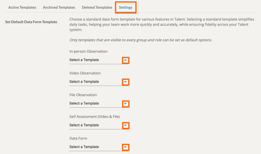 Next, click on the 'Settings' tab on the Data Forms page. This will load a list of various dropdown menus, from which you can set your default data form or rubric templates. Each menu item will determine the specific feature or area of the system these default templates will display.