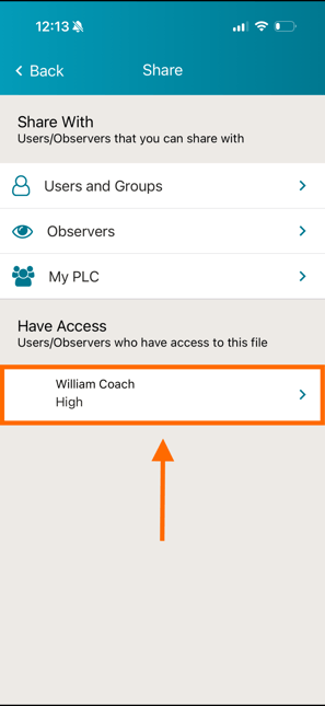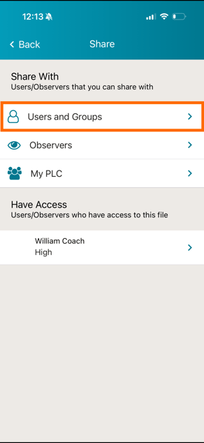 3. On the next page, choose the type of user you would like to share with (Users and Groups, Observers, or My PLC). Tap 'Users and Groups' if you merely wish to share with someone in the same system as you.