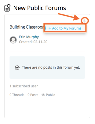 On the 'Forums' tab, find the forum you wish to subscribe to. If the forum is a public forum, you will have to add it 'My Forums' before subscribing to it. To do so, click on the forum's 'gear icon' in the top, right-hand corner.