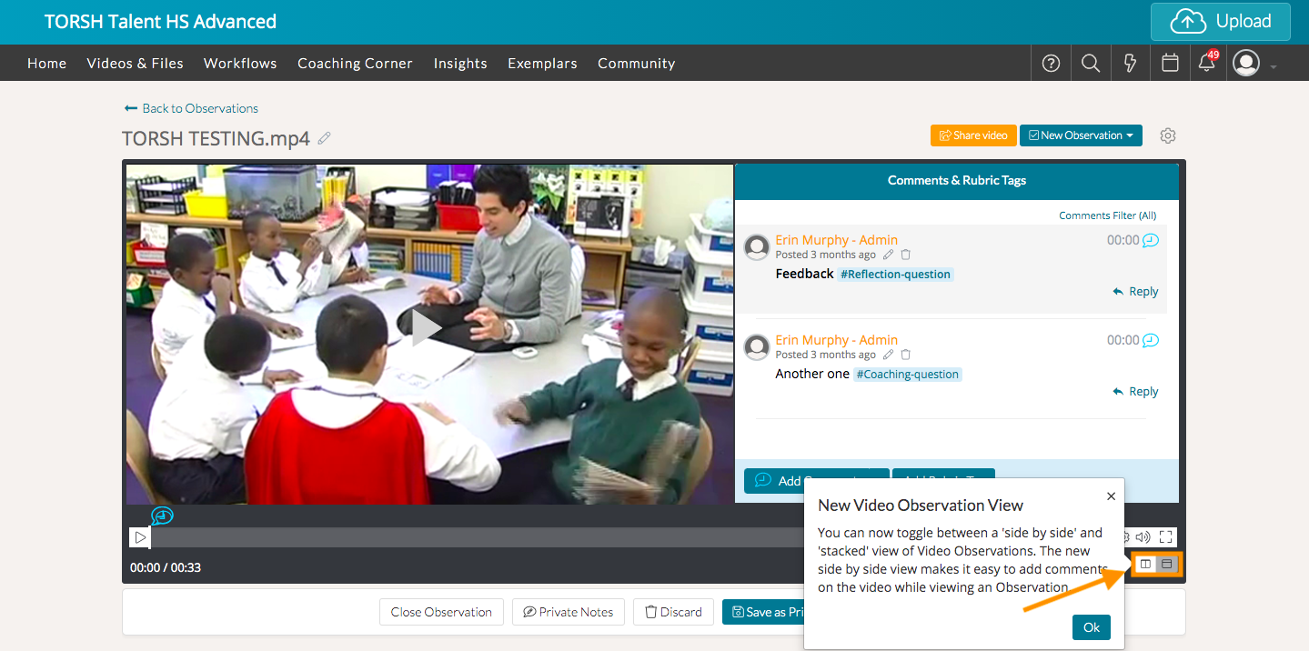 When performing a video observation, you can switch to a Side-by-Side View by clicking the 'Observation View' button beneath the playback bar.