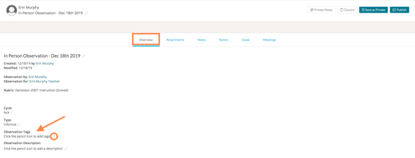 Once Observation Tags have been added to your system, you can begin using them! To do so, first start an observation or self assessment. From your observation's webpage, navigate to the Overview tab.