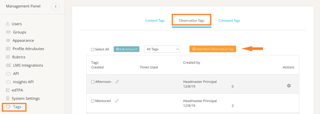 First, navigate to your Admin Management Panel. From there, select 'Tags.' Then click 'Observations Tags' tab. Next, click on the orange 'Add New Observation Tag' button.